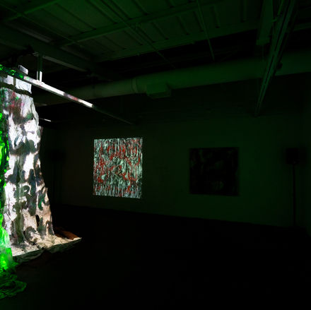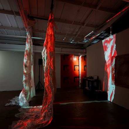 Paintings line the surrounding walls, each individually lit to encourage intimate encounters with the viewer. A documentary-style video woven into the space presents fragments of everyday life through spontaneous imagery, handwritten notes, and personal reflections. In the black room, digitally printed eyes envelop the viewer, surrounding them on all sides.